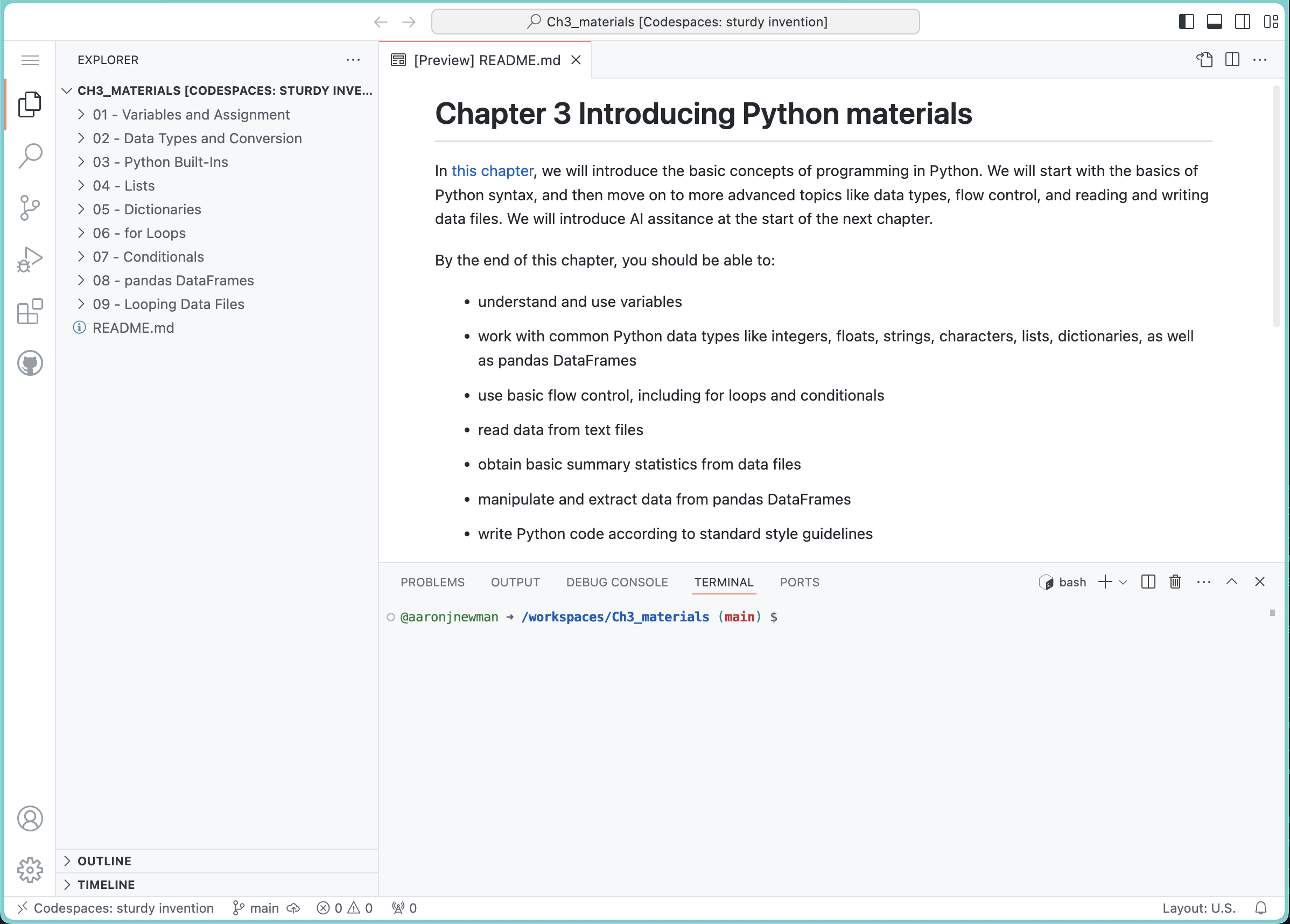 That’s all for now! All we wanted to do here was get something open in Codespaces. In the next chapter, we’ll start actually working through the Introducing Python materials.