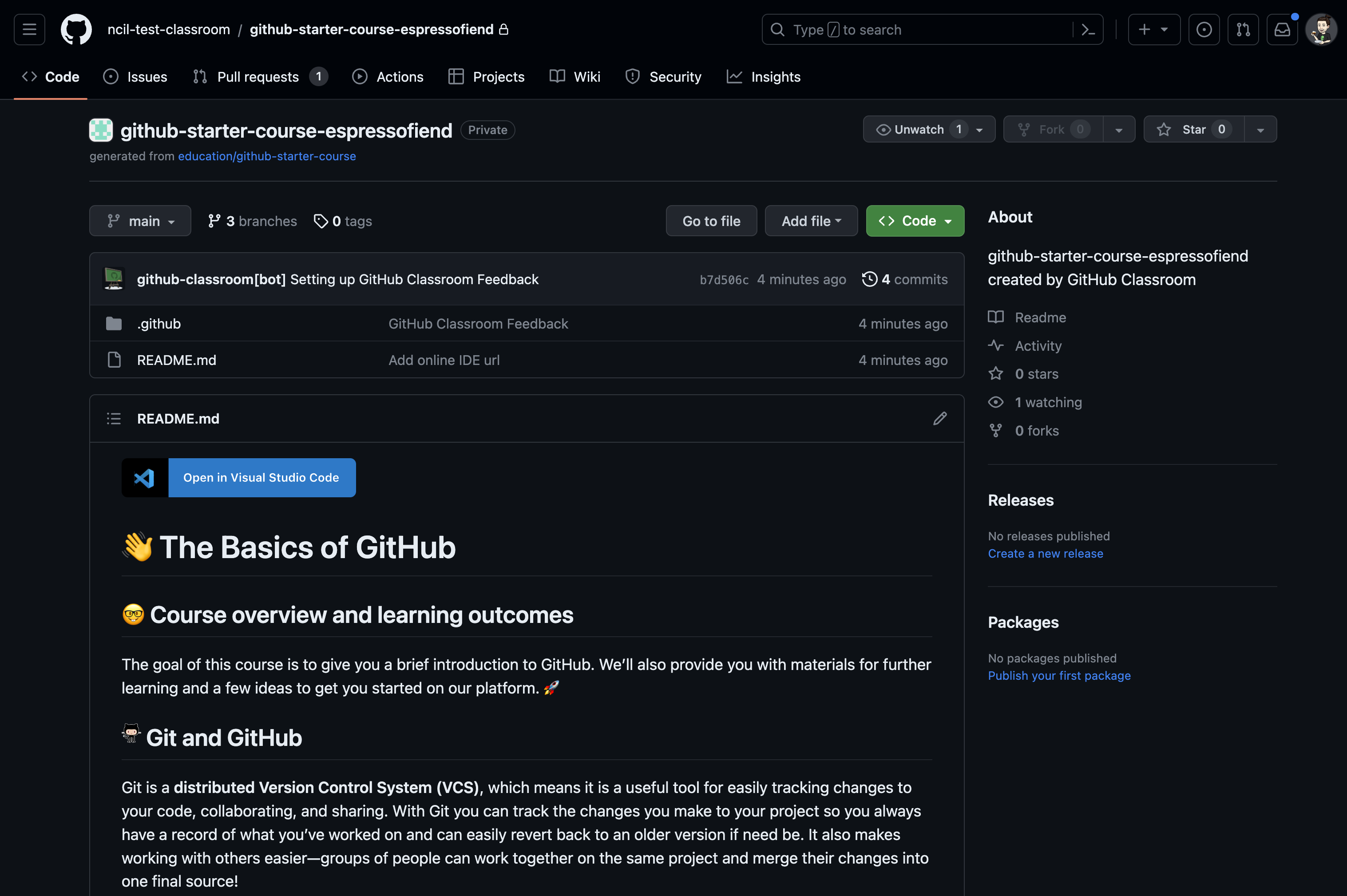 When you open the assignment repository, you will see the default view of the repository, which is basically what every repository on GitHub looks like. It will look something like this: