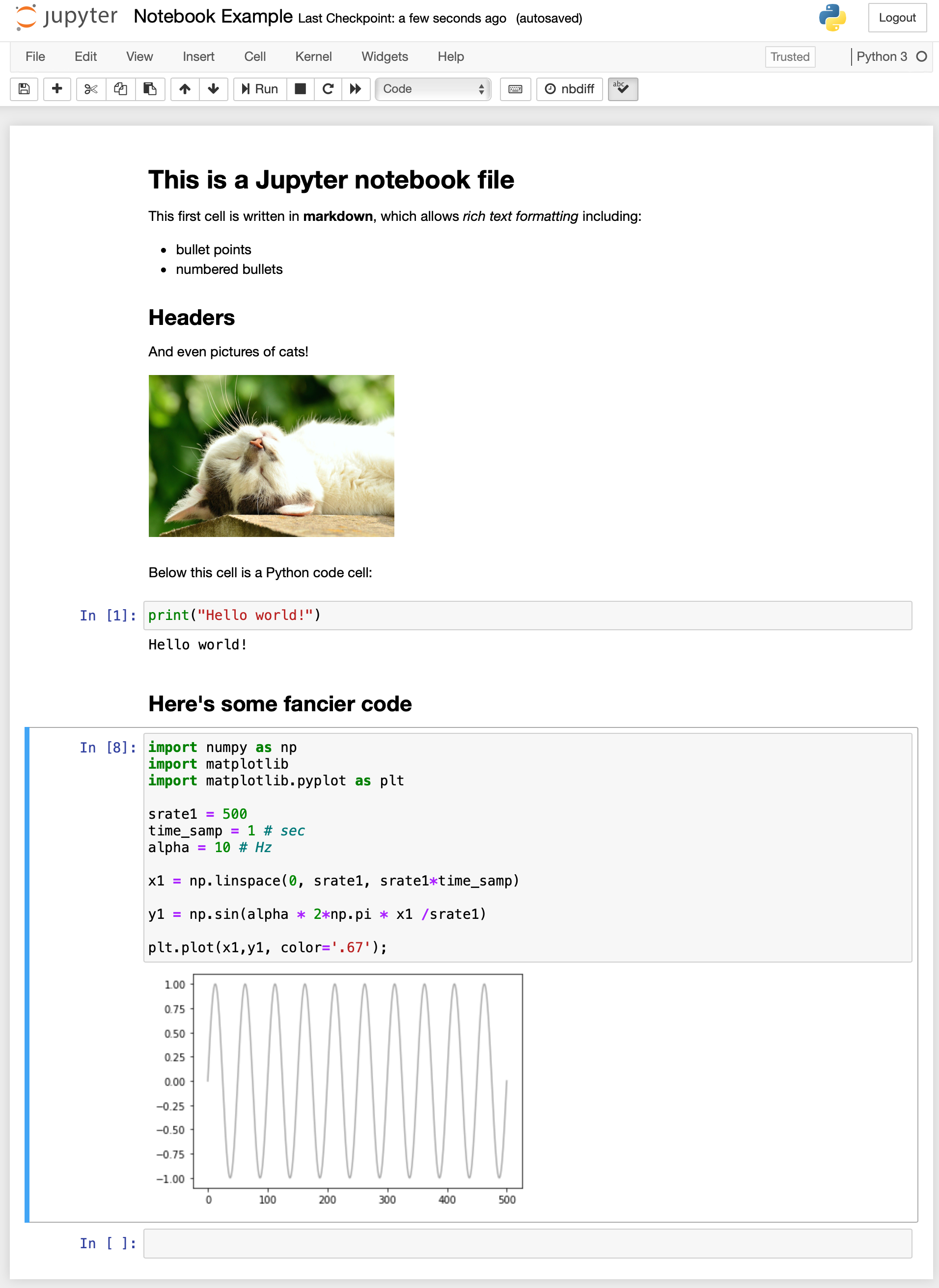 Another great feature of notebooks is that cells can contain either code, or text formatted in a simple language called Markdown. This means that in between your code cells, you can write blocks of text, for example to annotate or, essentially, “tell the story” of your data. Indeed, you could literally write a scientific manuscript in a Jupyter Notebook, with the advantage that it contained all of the reproducible code used to perform the analysis. Indeed, this textbook is largely written in Jupyter notebooks!